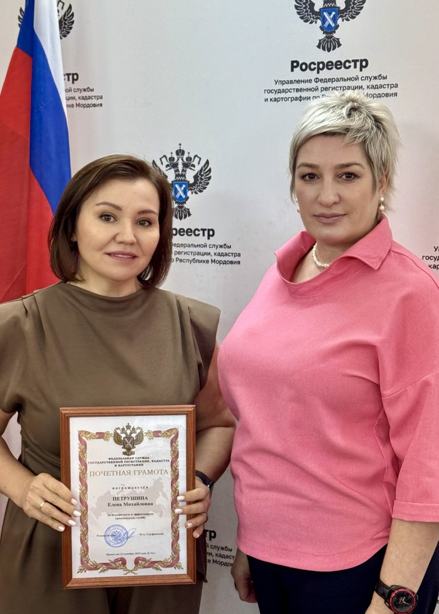 #КомандаРосреестра 📋 Еженедельное оперативное совещание в Управлении Росреестра по РМ началось с церемонии награждения 🎉 За безупречную и эффективную гражданскую службу Почётной грамотой Федеральной службы государственной регистрации, кадастра и картографии награждена Петрушина Елена Михайловна, специалист-эксперт отдела ведения ЕГРН 🤝 Руководитель Управления Светлана Балескова лично вручила награду Елене Михайловне, отметила ее высокие профессиональные достижения и выразила благодарность за добросовестный труд #Росреестр #РосреестрМордовия #Награждение #Мордовия