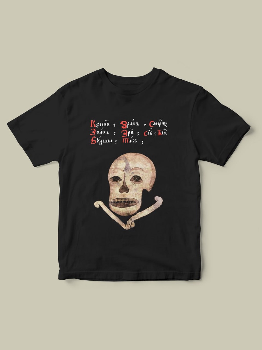 Футболка с черепом в магазине ЗЕЛО! zelomi.ru/shop ☠️Череп с двумя костьми — древняя эмблема бренности бытия и близости смерти. В христианстве ее заначение расширилось. По преданию, прах Адама покоится внутри Голгофы. Само название горы происходи от древнееврейского слова, обозначающего "череп". Иконография Распятия включает изображение пещеры в Голгофе с черепом — Адамовой головой. 📖В качестве напоминания о неизбежности смерти череп часто встречается в Синодиках — книгах для поминания усопших. Одна из таких миниатюр сопровождается стихотворением: "Кости зрак - смерти знак. Зри сие - всяк будеши так" ("Вид костей - символ смерти. Посмотри на это - ты станешь таким же"). 🤘Футболка Зри сие снова в магазине ЗЕЛО. Она напоминает о брутальной моде 1980х, но с древнерусским весельем.