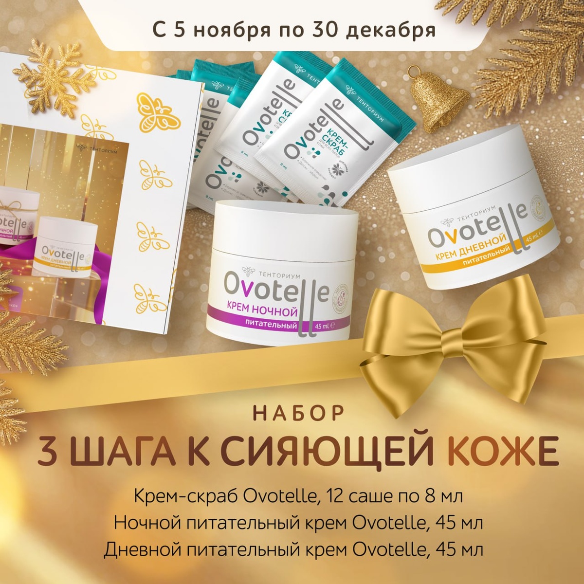 🔹 Три шага к сияющей коже (крем-скраб Ovotelle 12 шт., ночной питательный крем Ovotelle, дневной питательный крем Ovotelle) с выгодой 5%.