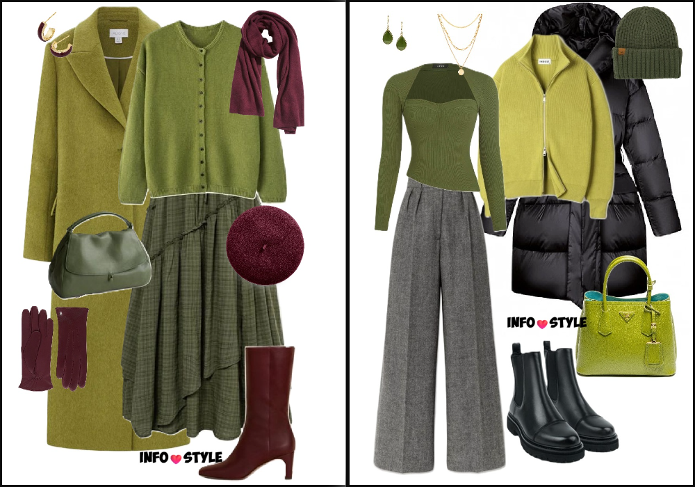 В осенне-зимнем сезоне палитра смещается в сторону глубоких и насыщенных зелёных, от практичного хаки до тёплого оливкового и яркого шартреза. Эти оттенки легко вписываются в городской гардероб: они выглядят стильно по‑отдельности и эффективно работают в сочетаниях, добавляя образу глубину, свежесть или контрастный акцент.