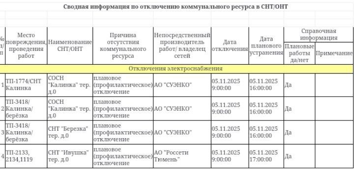 Информация по плановым отключениям в СНТ/ДНТ на 05.11.2025 от ЕДДС города Тюмени