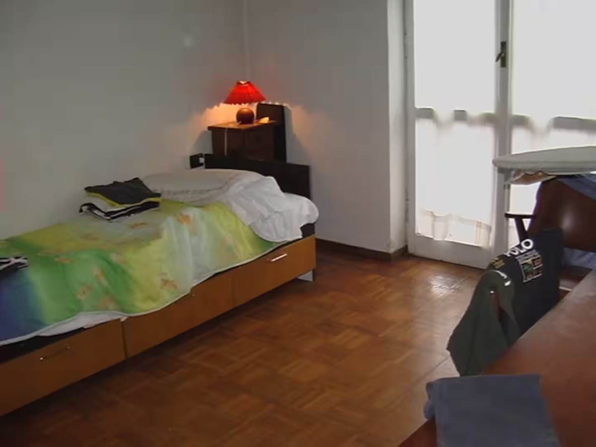 Кровать, стол и полный хаос. Древняя деревянная кровать съела полкомнаты. На ней зелёный плед, жёлтая подушка, простынь непонятного цвета, ощущение, что всё это стирают раз в два месяца, если повезёт. А ещё торчат какие-то выдвижные ящики, от которых становится только хуже.