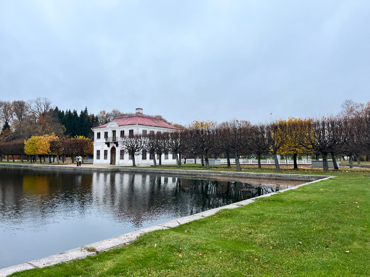 По берегу дошли до павильона Эрмитаж. Это очень распространенная постройка для 18 века. На первом этаже располагались повара, готовившие и сервирующие стол, который потом на подъемниках поднимали на второй этаж, где располагались гости.