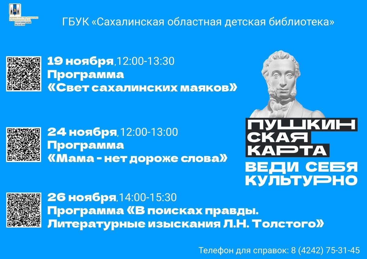 Дорогие друзья! Сахалинская областная детская библиотека приглашает в ноябре на мероприятия в рамках программы «Пушкинская карта». Узнать информацию о мероприятии и приобрести билет можно по QR-коду или по ссылке: 19 ноября, 12:00-13:30 Программа «Свет сахалинских маяков» - https://clck.ru/3Q9B5z 24 ноября, 12:00-13:00 Программа «Мама - нет дороже слова» - https://clck.ru/3Q9B62 26 ноября, 14:00-15:30 Программа «В поисках правды. Литературные и изыскания Л.Н. Толстого» - https://clck.ru/3Q9B63