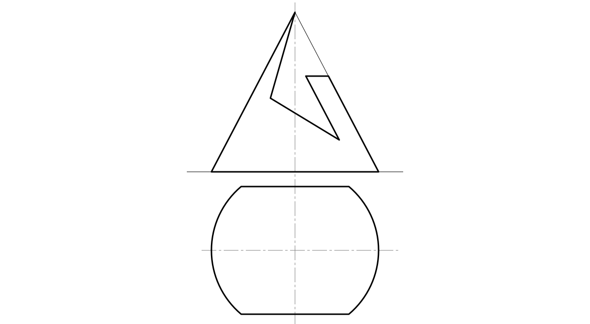 Стоит упомянуть, что фронтальная проекция заднего среза конуса полностью совпадает с проекцией переднего среза. Надеюсь, это понятно.