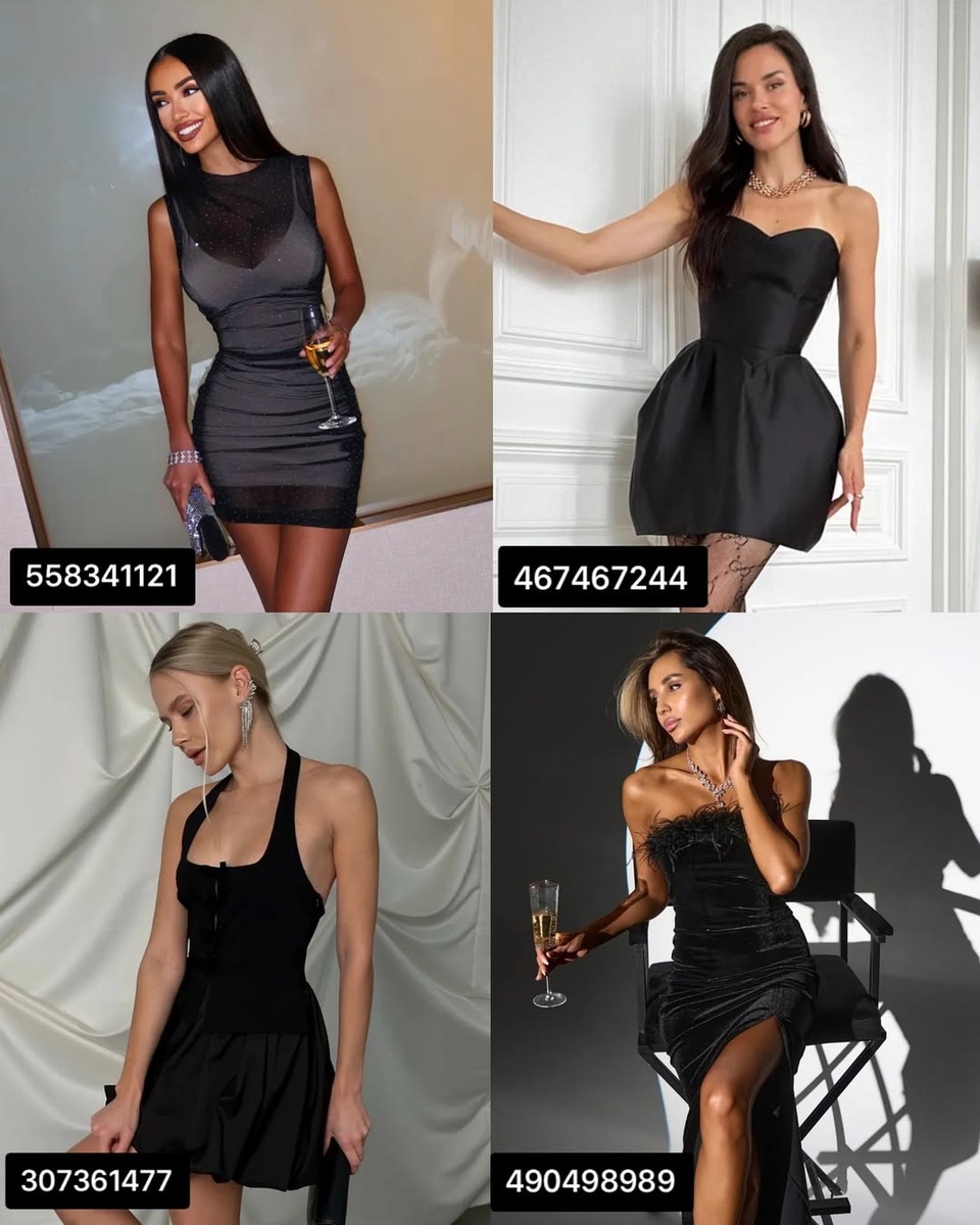 Восемь платьев с вайлдберриз дают восемь совсем разных сценариев праздника. Чёрные модели с бархатом, перьями и интересным кроем (артикулы 558341121, 467467244, 307361477, 490498989) — для тех, кто выбирает вечную классику, но в обновлённом, модном прочтении.