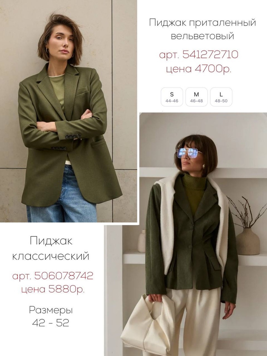 Второй пиджак — более строгий вариант в той же зелёной гамме. Это классика, которую легко вписать и в рабочие дни, и в праздничные.