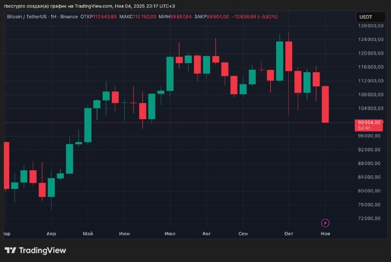 ️️ Биткоин упал ниже $100 тыс. впервые за 4 месяца (минус 22% от исторического максимума)