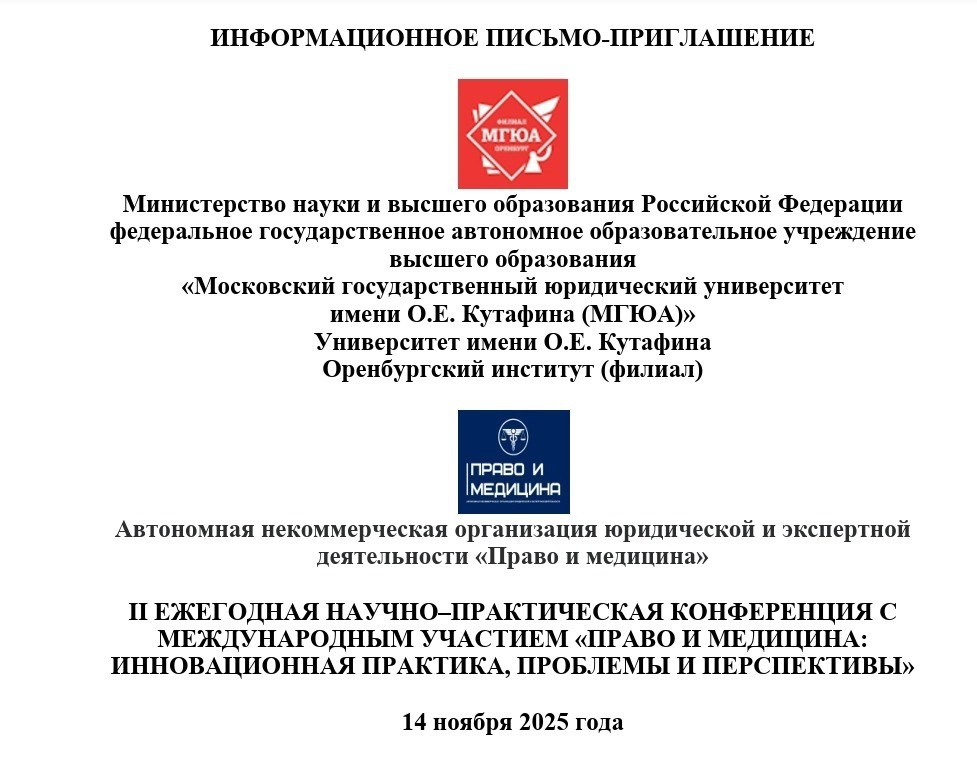 Холодным ноябрьским днём стоит посетить жаркие юридические и судебно-медицинские дискуссии на конференции в Оренбурге. II Ежегодная научно–практическая конференция с международным участием «Право и медицина: инновационная практика, проблемы и перспективы», состоится 14 ноября 2025 года в 8:00 по московскому времени в очном, заочном и онлайн форматах. Организаторы: Оренбургский институт (филиал) Университета имени О.Е. Кутафина (МГЮА) и мои модераторы по секции Негосударственная судебно-медицинская экспертиза на Конгрессе СМЭ - Автономная некоммерческая организация юридической и экспертной деятельности «Право и медицина». Программа🔥🔥🔥 UPD: https://www.oimsal.ru/sites/default/files/julia/obedinennaya_programma.pdf Участие в конференции бесплатное Желающие принять участие в Конференции в качестве слушателя должны выслать на адрес Оргкомитета заявку на участие до 6 ноября 2025 года (включительно). Заявки на участие по форме Приложения 1 (информационное письмо кладу в комментарии)