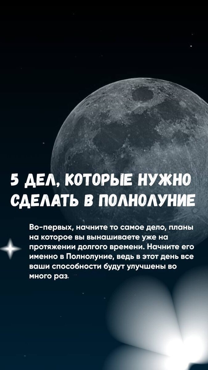 Полнолуние: пик силы и откровений. Сегодня ночь освещена самым ярким светом — это полнолуние, время, когда энергии достигают своего пика. 🌑 Эмоции могут быть ярче, старые вопросы — требовать ответов, а подсознание — говорить с нами через сны и внезапные озарения. Что важно помнить сегодня: ⏺Это время кульминации и итогов. Что в вашей жизни достигло своей полноты? ⏺Энергии мощные, но не агрессивные. Они как большой мощный океан — можно испугаться его силы, а можно научиться ловить его волну. ⏺Идеальный вечер для того, чтобы отпустить. Напишите на бумаге все, что отягощает вашу душу, и с благодарностью сожгите лист. Полная Луна заберет это с собой. 🔥 Проведите этот вечер в осознанности и мягкости к себе. Даже самая сильная энергия становится целительной, когда мы пропускаем ее через сердце. ❤️