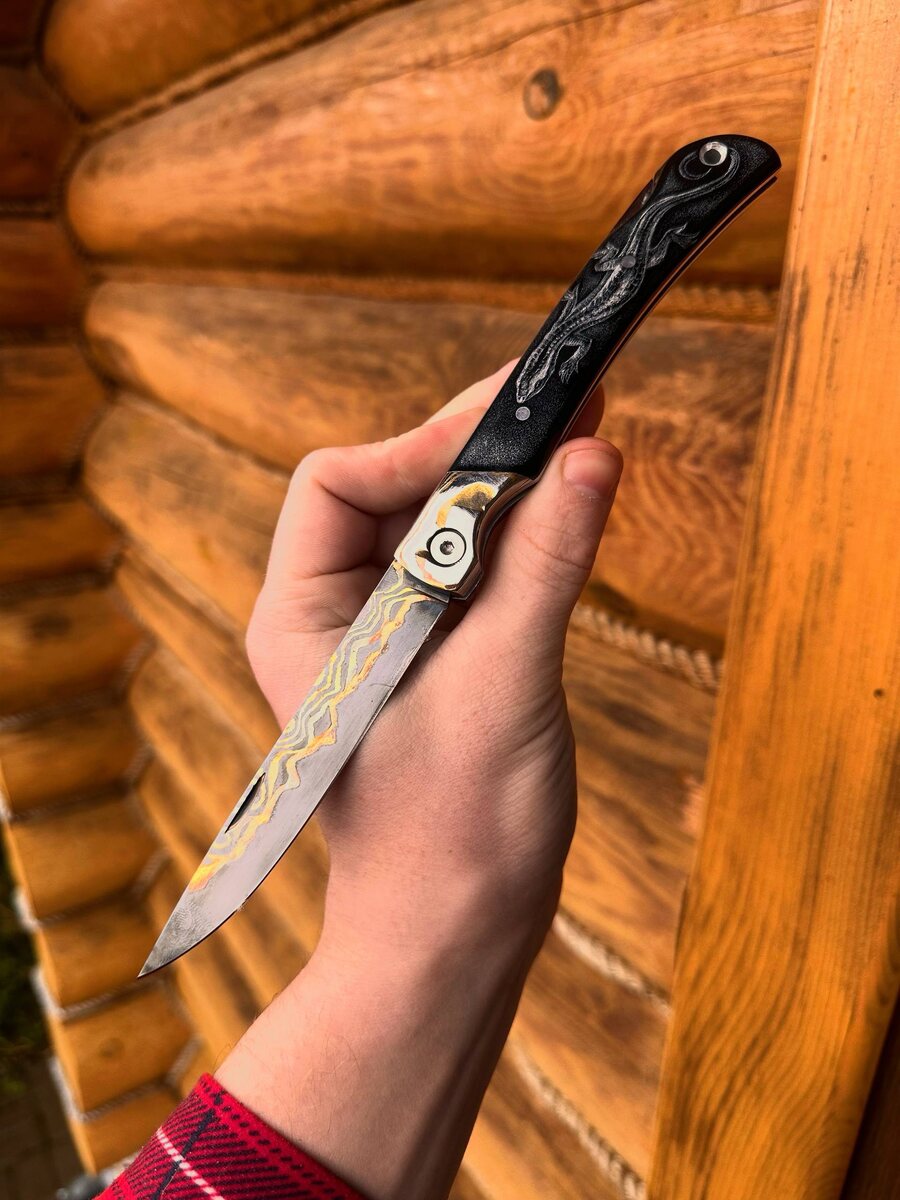 🔥 В единственном экземпляре! Складной нож «Мексиканец» — настоящее произведение искусства для ценителей ручной работы и коллекционеров. ⠀ 🌪 Клинок — сложный ламинированный дамаск с добавлением меди. Невероятный рисунок и высочайшая прочность (HRC 62) — для тех, кто ценит исключительную резучесть и стиль. ⠀ ✨ Накладки из мокумэ-ганэ и черного акрила с эксклюзивным скримшоу с двух сторон. Такой нож невозможно повторить — это уникальный экземпляр! ⠀ 🔪 Заточка — бритвенная: готов к самим тонким и точным работам. ⠀ 🧳 В комплекте — формованные кожаные ножны из кожи растительного дубления, которые подчеркнут статус и надёжно сохранят нож. ⠀ 💰 Цена: 78.000 руб. ⠀ Коллекционный уровень. Для ценителей, коллекционеров, подарка особому человеку — это больше, чем нож. ⠀ 👉 Пиши для заказа: @Nazarklinokbot или WhatsApp/Viber: +7 910 134-38-31 #кузницаназарова #ручнаяработа #дамаск #уникальныйнож #коллекция #подарокмужчине #mexicanknife #скримшоу