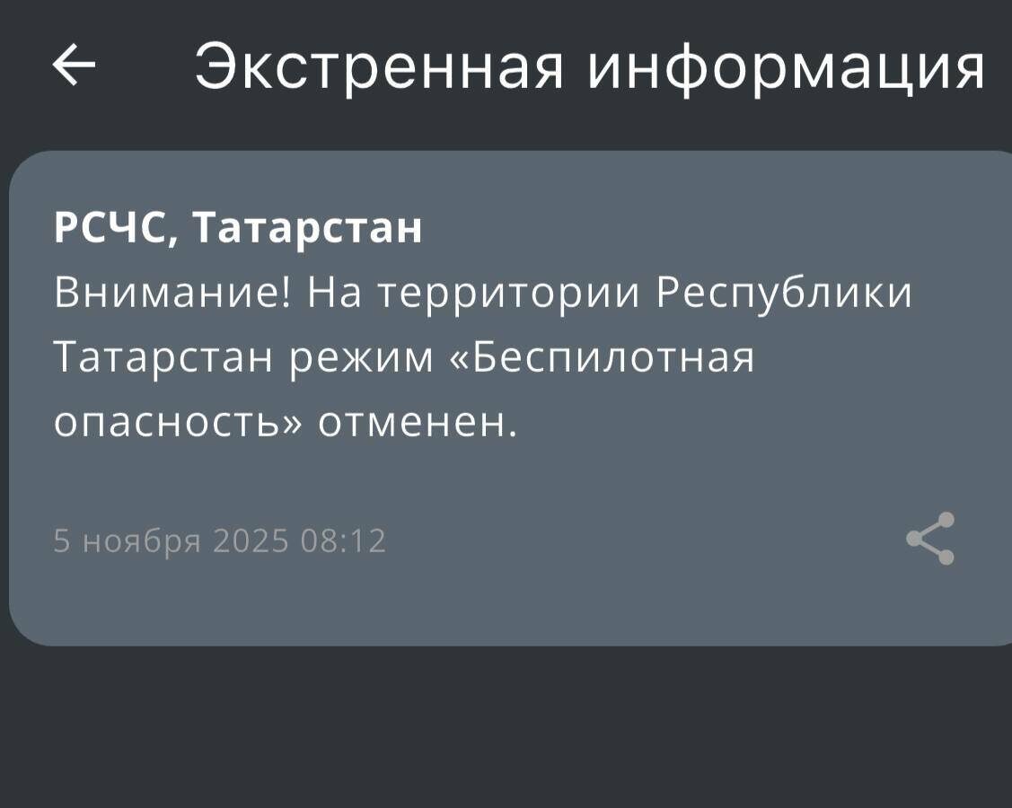 В Республике Татарстан в 08.12 сняли режим «Беспилотная опасность». Информация об этом появилась в официальном приложении МЧС России. Напомним, что режим действовал на территории республики с 02.37 по московскому времени.