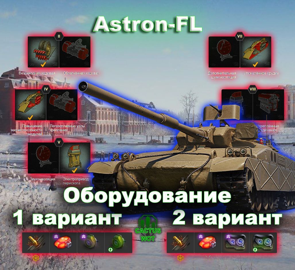🇺🇸Astron-FL 🏦Тяжелый танк поддержки 10 уровень. 🚓Оборудование и полевая модернизация танка Astron-FL на картинке🔼 ➕Плюсы танка 📈Почти отсутствует КД перезарядки, но при грамотном контроле его нагрева. 📈Мощное лобовое бронирование корпуса и башни по 300 мм, позволят эффективно использовать броню. 📈Уникальная механика огнемётного орудия, позволяет постоянно оказывать давление на противника на коротких расстояниях. 📈Хорошая мобильность для тяжёлого танка, максимальная скорость — 40 км/ч, которая с турбиной увеличивается до 45 км/ч. 📈Обзор в 400 метров. 📈УВН -10/+20 градусов позволяет эффективно использовать холмы. 📈Выбор типа огнесмеси для ближнего боя (больше урона) или средней дистанции (больше радиус). 📈Хорошая живучесть благодаря 2300 единицам прочности, которая с закалкой может быть увеличена до 2600 единиц. 📈Высокая скорострельность огнемёта. 📈Немного навесная или парраболическая траектория полёта огнесмеси, что делает возможным в прямом смысле выкуривать врагов