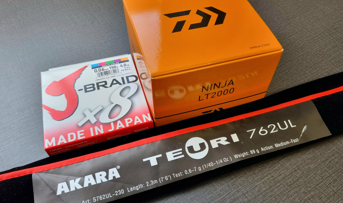 В его основу лег нашумевший, в уходящем сезоне, спиннинг Akara Teuri S762UL (230) 0,6-7 г., удилище в "солидовом" исполнении, явно специализирующееся на микроджиговой ловле. При подборе комплектной катушки, постарался совместить пресловутый принцип "цена=качество", не переборщить с весом этого элемента, и ближе всего попасть в цветовое совмещение. Поэтому катушка Daiwa 23 Ninja LT 2000, оснащенная восьмижильным плетеным шнуром Daiwa J-Braid 0,06 мм, в цвете Multicolor, подошла как нельзя к стати.