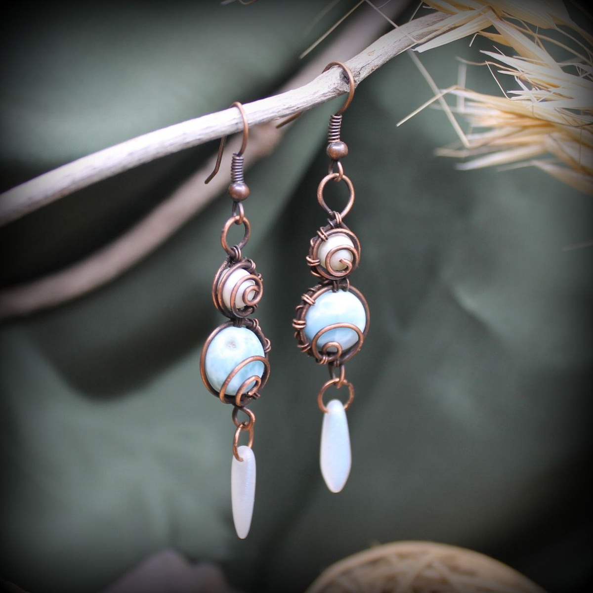 Серьги классические "Айле", с ларимаром. Среди морских льдов и снежных торосов живет Дева Айле. Кожа ее бела, как снег, а глаза голубые, как море. Сидит Айле на льдине, песни поёт, да вплетает в косы снежные перья. В песнях ее шум и грохот волн, и вой холодного ветра. Шелест крыльев и клёкот северных птиц. Снег и метель в её песнях, и солёные брызги. Песни поёт Але. Поднимается буря. ------------------------------------- Классические серьги с подвесками. Сделаны вручную из меди, затем покрыты патиной и отшлифованы, для проявления рисунка. Серьги длинные, но очень лёгкие. Подвески - чешские стеклянные бусины. Камень - ларимар и хрустальный жемчуг австрийского производства. Длина без швенз 5 см. #медныесказки #ручнаяработа #медныесерьги #длинныесерьги #легкиесережки #ларимар #бохосерьги #нежныесерьги #украшенияручнойработы #серьгиручнойработы