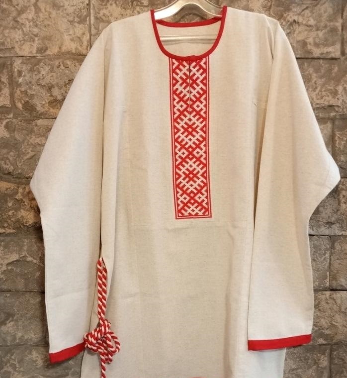 Мужская рубаха (косоворотка или прямого кроя) была туникообразной, длинной (до колен), часто с разрезом сбоку на воротнике. Её носили навыпуск и обязательно подпоясывали. Цвет полотна был натуральным, неотбеленным, или же окрашенным растительными красителями. По праздникам надевали рубахи из более тонкого, отбеленного льна, с более яркой и обильной вышивкой по вороту, подолу и манжетам.