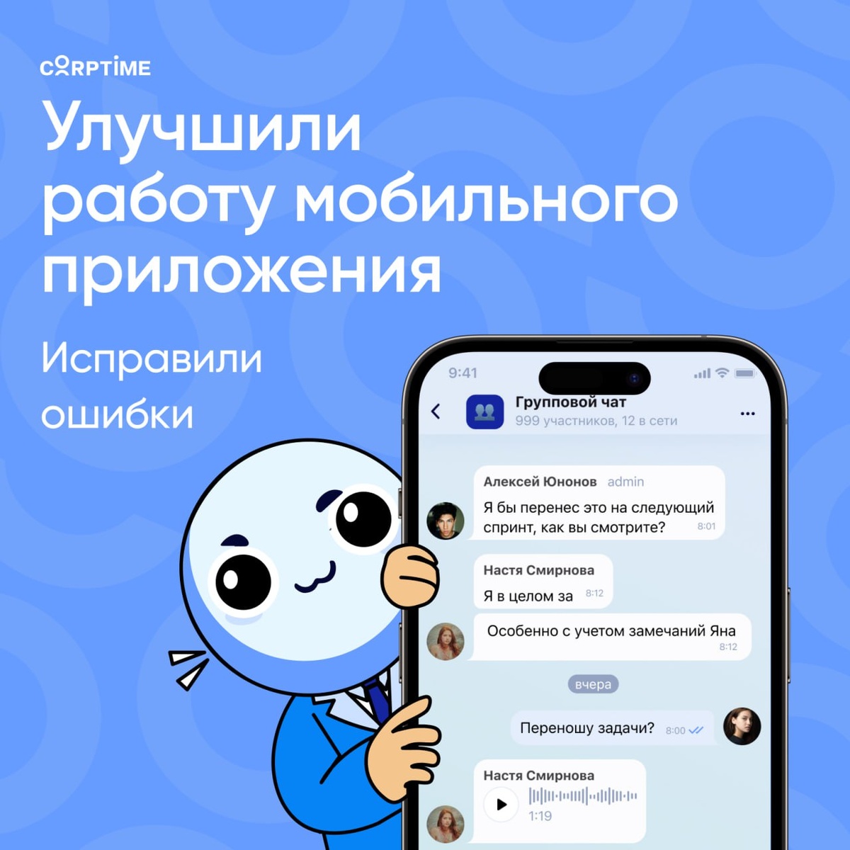 Улучшили работу мобильного приложения: релиз 22.0 Каждый день наша команда тестирует приложение, дорабатывает функционал и все это не без обратной связи от наших пользователей и… нашей команды. Так как мы сами активно используем CORPTIME в работе. В этот раз исправили ошибки в мобильном приложении: теперь эти баги не будут мешать в коммуникации нашим пользователям. 1. Видеосообщения в чат стабильно загружаются и доставляются адресату. 2. При свайпе участников чата интерфейс отражается стабильно при пролистывании списка. 3. Добавили заглушки для участников компании, филиалов и отделов. Это улучшило восприятие интерфейса при загрузке данных. 4. Push-уведомления при подписке на компанию работают стабильно. 5. Администрирование: функционал локализации тематик бизнесов временно перенесен в веб-админку. Это позволит централизованно управлять настройками и ускорит будущие обновления. 6. Оптимизировали структуру коммуникаций: удалили общий чат, который создавался вместе с пространством комп