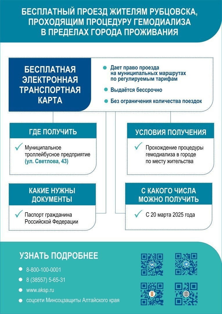 Жителям шести городов Алтайского края, проходящим гемодиализ в городе их проживания, предоставляется бесплатный проезд в общественном транспорте 📍По инициативе Губернатора Алтайского края В.П. Томенко гражданам, проходящим процедуру гемодиализа, в пределах населенного пункта их проживания, предоставлено право на бесплатный проезд на общественном транспорте без ограничения количества поездок. 👉Где получить бумажный проездной билет - смотрите в карточках 🙌Кроме того, гражданам, направленным для прохождения гемодиализа и проживающим в населенных пунктах, где нет диализных центров, органами социальной защиты населения ежемесячно предоставляется компенсация стоимости проезда. С 1 марта стоимость поездки составляет от 750 до 3750 рублей. #Алтайскийкрай #Минсоцзащита_22 #Гемодиализ