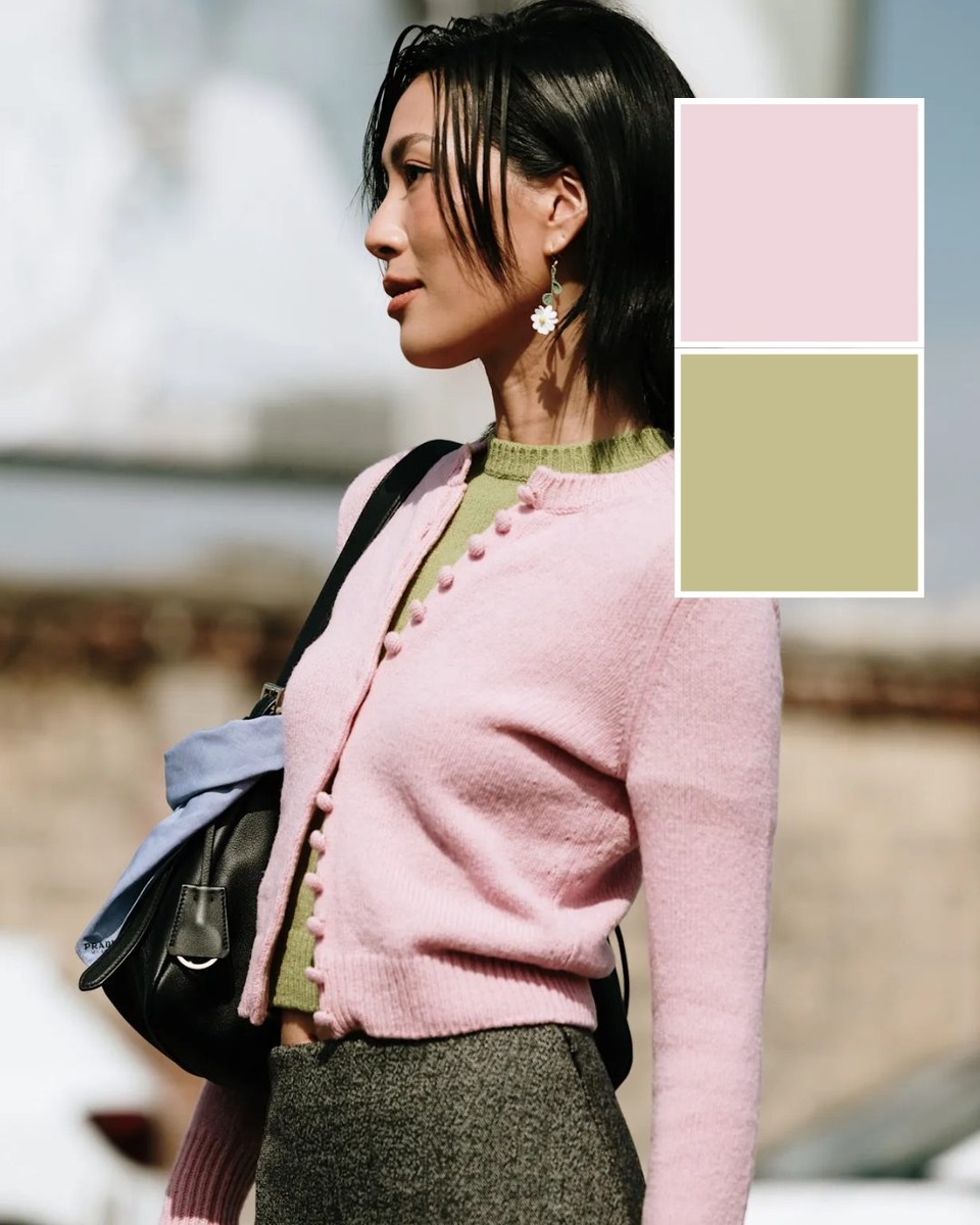 Этой осенью мода стала тише, теплее и умнее. Яркость уступила место нюансам, а классические оттенки научились звучать по-новому — в неожиданных комбинациях. Вдохновляясь уличным стилем Милана и Парижа, я выделила шесть цветовых дуэтов, которые уже стали формулой стиля сезона. Розовый и оливковый Нежность встречает устойчивость. Пастельный розовый кардиган и фисташковый топ — сочетание, будто созданное для мягкого осеннего утра. Здесь нет кричащего контраста, только тонкое столкновение эмоций — романтики и спокойствия. Небесно-голубой и шоколадный Элегантное возвращение ретро-палитры. Голубая рубашка под кожаной курткой цвета эспрессо — сочетание уверенности и лёгкости. Напоминает мужской гардероб 70-х, но выглядит современно благодаря простым линиям и фактурам. Тёплый коричневый и мандариновый Оранжевый вновь в игре, но теперь его приглушили каштаном. Это сочетание словно собрано из осенних листьев и карамельного латте. Идеально для тех, кто хочет тепла, но без банальной бежевой палитр