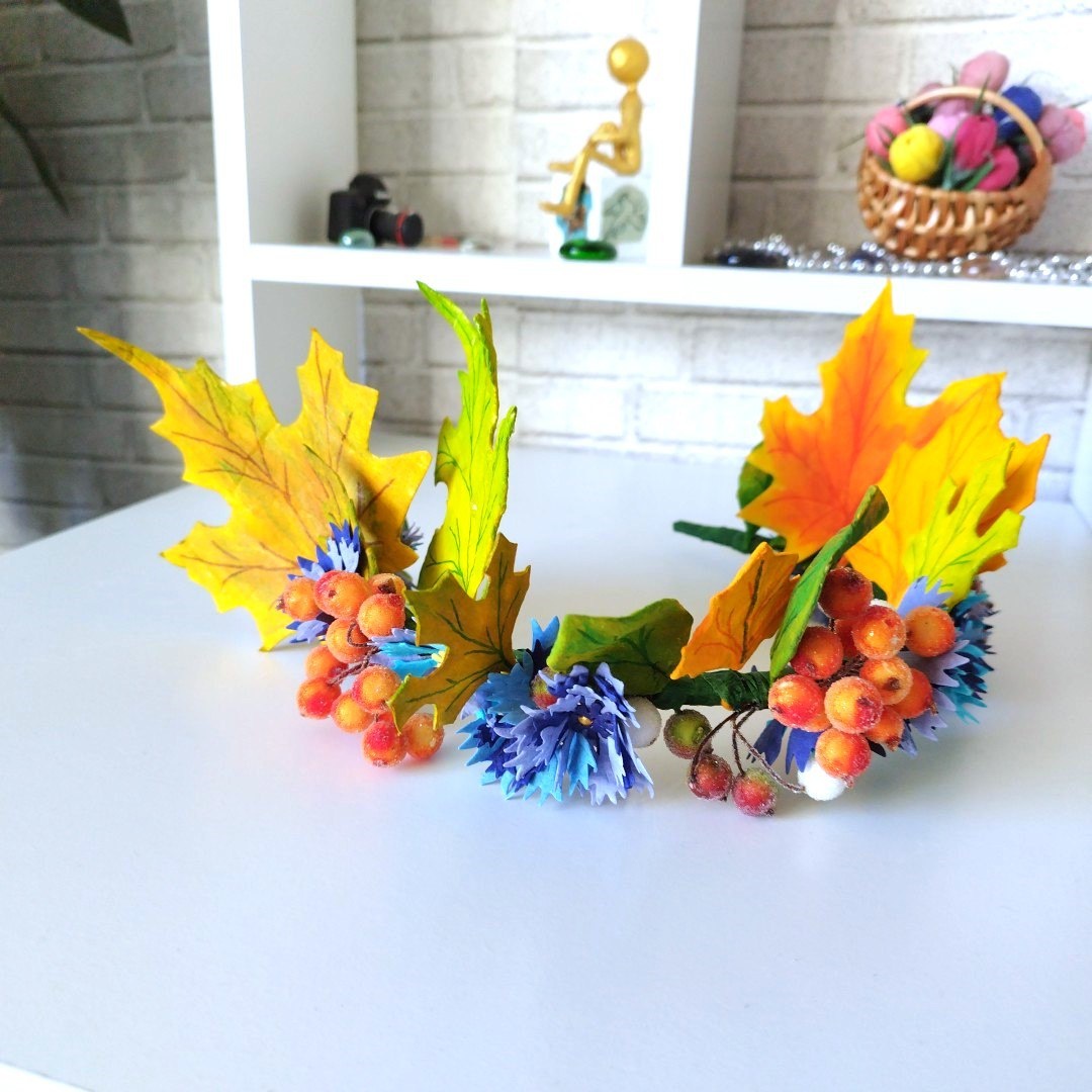 А еще сделала себе головной убор осенний красивый. Все из ваты, увидела в магазине ягодки и сделала себе такие же, но ватные и посыпка для дорог мелкая пригодилась, ну прям как магазинные ягодки получились