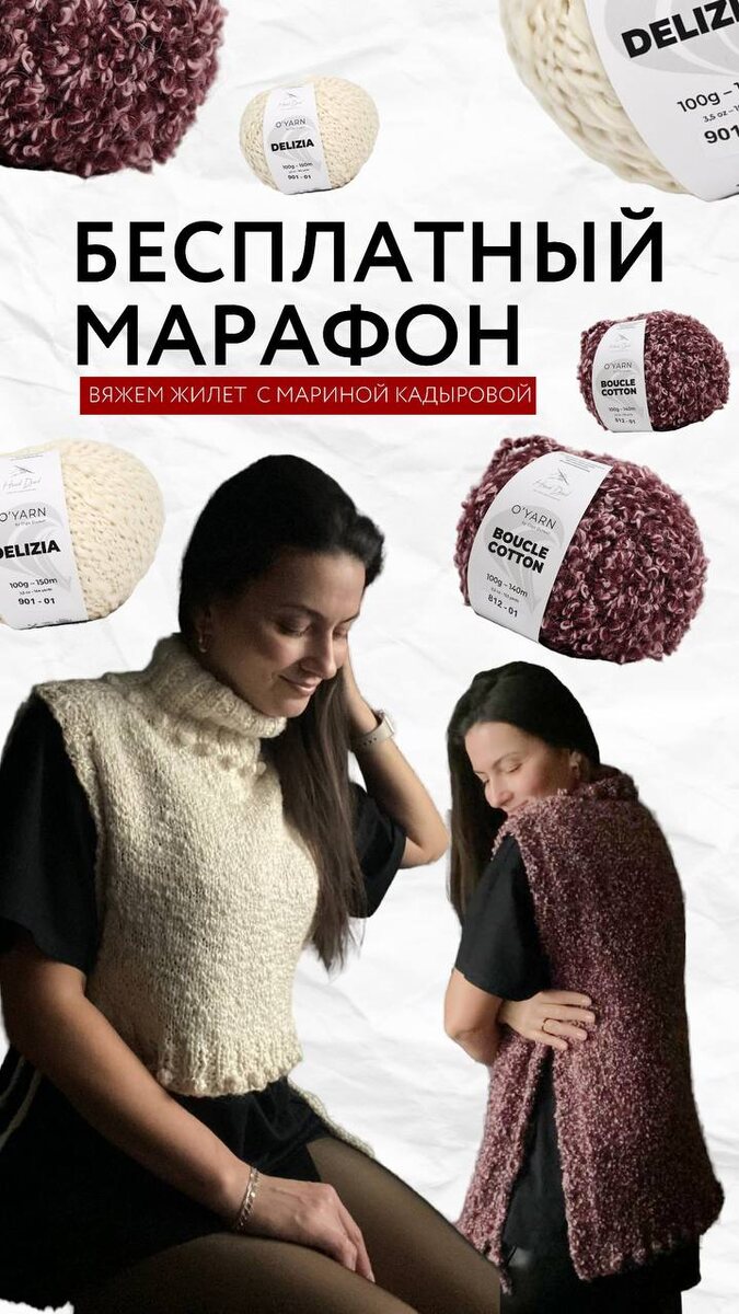 БЕСПЛАТНЫЙ МАРАФОН ПО ВЯЗАНИЮ ЖИЛЕТА ИЗ BOUCLE COTTON и DELIZIA ❤️ Этот жилет вы точно захотите связать! Идеальный вариант для вашего зимнего образа! Мягкий, уютный, модный, а самое главное - ТЕПЛЫЙ! 📆 Старт 12 НОЯБРЯ — финиш 12 ДЕКАБРЯ Вяжем стильный, уютный жилет! ПРИСОЕДИНИТЬСЯ К МАРАФОНУ 📑 Формат простой: - Участие БЕСПЛАТНО - Можно вязать ИЗ ЛЮБОЙ ПРЯЖИ - Вход в марафон открыт до 1 декабря - После 1 декабря группа ЗАКРЫВАЕТСЯ - Материалы доступны БЕСПЛАТНО до 12 декабря - После 12 декабря — только ПЛАТНО в формате МК у мастера Марины Кадыровой 🧶 ПРЯЖА 🧶 - Основная: DELIZIA и BOUCLE COTTON от O’YARN 💥 СПЕЦИАЛЬНО для этого МАРАФОНА мы объявляем беспрецедентную акцию! Такого еще никогда не было! Так как в марафоне можно будет вязать изделие сразу из двух артикулов O’YARN, то мы объявляем АКЦИЮ: 👉 СКИДКА 3% НА DELIZIA и на все букле на нашем сайте по промокоду «пайетка» ‼️ При покупке от 10 мотков в любом соотношении BOUCLE COTTON/BOUCLE ALPACA и DELIZIA, мы дарим 1 б