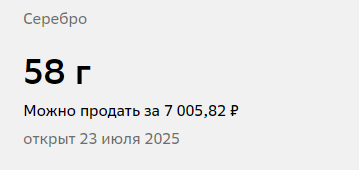 Доброго утра! Вот сегодня снова среда, значит, продолжаю покупать серебро. Сегодня, правда, получился 1 грамм. Ну вот, на подножном корме пока держусь, как говорится. Пока без шика. Зато теперь у меня серебра на 7 тысяч! Немного, но уже начало положено. Если сегодня до 19:00 дадут мужу зп, то добавлю ещё. А пока и так хорошо! Зато 12-гокак накуплю! Лишь бы цена упала, а не подросла. Вот цена, которую сегодня заплатила за грамм: Вот какова цена была в прошлую среду: Так что всё равно цена немного выросла. Ладно! А вот в ВТБ сегодня можно купить грамм за 130,67 рублей, в Альфа - 132 рубля за грамм, так что акция от Сбера рулит. По моим накоплениям: 737 921 рубль. Думаю, что накопления на брокерских буду считать раз в неделю, цена постоянно меняется, смысла подсчитывать каждый день их нет. А вот резерв - есть. Сегодня 4882 рубля. Пока держусь от того, чтобы изъять деньги. Даже на секцию младшего сына деньги не трогаю - правда, там собрано не все. Только на 1696 рублей вместо 2400. До