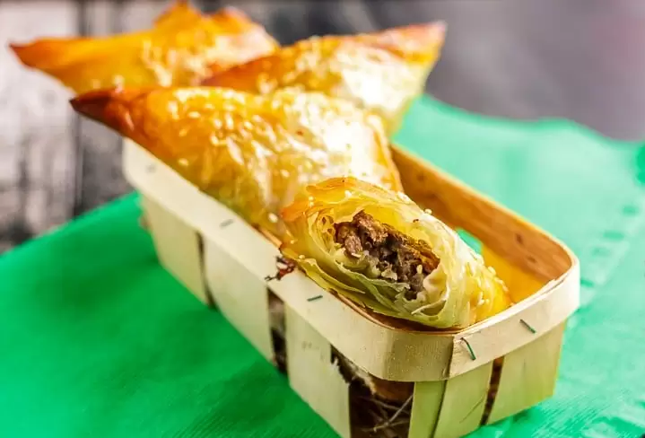 14. Таким же способом сформируйте остальные пирожки, располагая их на противне на расстоянии друг от друга: поскольку тесто фило бездрожжевое, оно не поднимется, но пирожки немного увеличатся за счёт пара внутри.