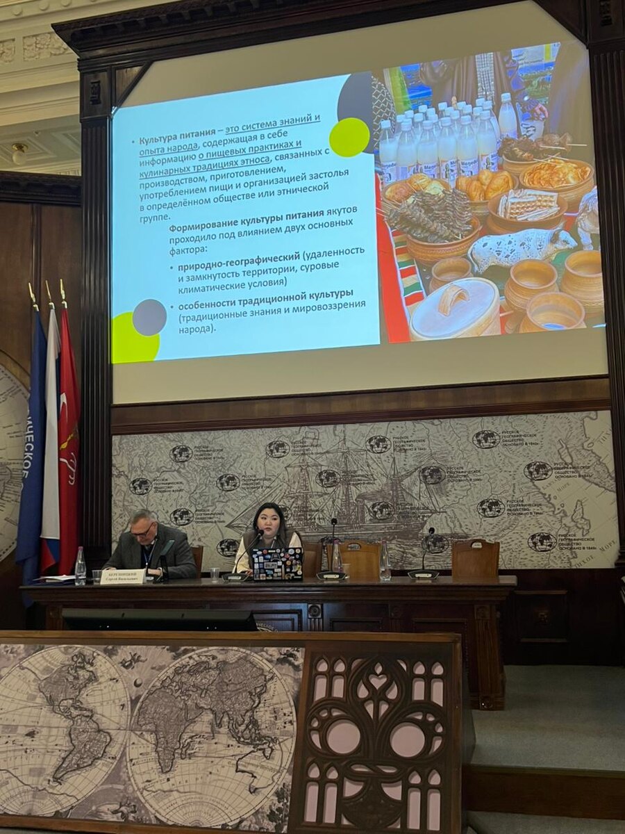 Доклад о якутской кухне на всероссийской конференции! С 27 по 29 октября в Санкт-Петербурге при поддержке Русского географического общества прошла конференция «Сибирские чтения-2025». От нашего института с докладом выступила Саргылана Михайлова, руководитель проекта«Культура питания: от традиций до мирового бренда». Ключевые моменты: Тема доклада: «Особенности пищевого режима в системе питания якутов: традиции и современность». Площадка: Музей антропологии и этнографии (Кунсткамера) РАН. Программа: Проект реализуется в рамках «Приоритета-2030». Наша коллега рассказала участникам конференции со всей страны о том, как сочетаются традиции и современность в питании народов Якутии. Выступление прошло в секции «Ресурсы и этничность» и вызвало живой интерес у научного сообщества. Это отличная возможность заявить о якутской культуре питания на федеральном уровне и важный шаг в продвижении наших исследований в рамках программы «Приоритет-2030»!