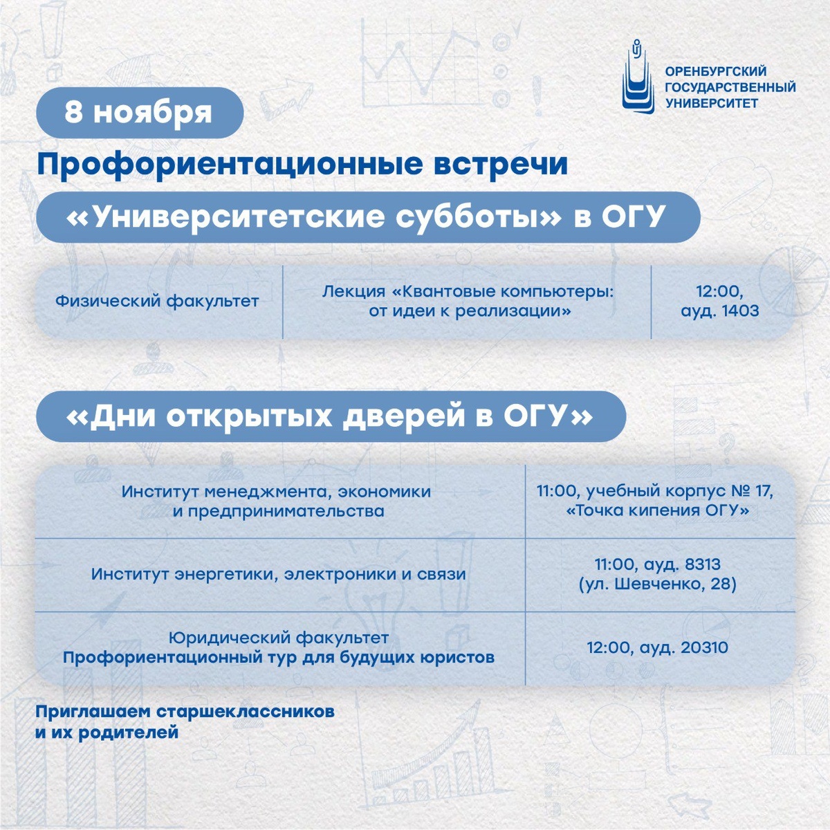 Квантовые компьютеры и перспективные профессии: ОГУ ждет гостей 💥 В Оренбургском госуниверситете продолжаются открытые профориентационные мероприятия для школьников и их родителей. 8 ноября свои двери откроет Институт энергетики, электроники и связи, Институт менеджмента, экономики и предпринимательства и юридический факультет. А на физическом факультете можно будет послушать лекцию «Квантовые компьютеры: от идеи к их реализации» 🤓 ВАЖНО! Пропуск в учебные корпуса осуществляется при наличии документа, удостоверяющего личность (свидетельство о рождении или паспорт). 📌 Познакомиться с расписанием проведения «Университетских суббот» можно по ссылке 📞 Задать дополнительные вопросы можно по номеру: (35-32) 37-25-55 🔗ОГУ: Телеграм | ВКонтакте #ОГУ #в_ОГУ #OSU #УниверситетскиеСубботы