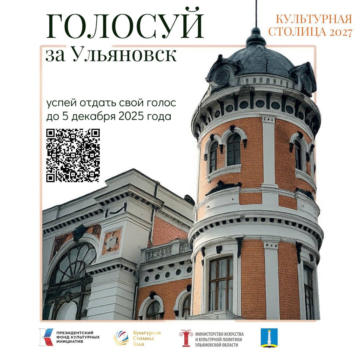 Ульяновск – это сердце культуры Симбирской земли! Здесь гармонично переплетаются история и современность, рождаются вдохновляющие идеи и проекты, а культурные традиции бережно сохраняются и передаются из поколения в поколение. Поддержите наш любимый город в Народном голосовании конкурса «Культурная столица 2027 года», чтобы представить нашу культуру всей стране. Голосование доступно на портале Госуслуг. Вы можете отдать свой голос прямо сейчас по ссылке: https://clck.ru/3Q6Ctr. Не забудьте поделиться этой новостью с друзьями, коллегами и родными!