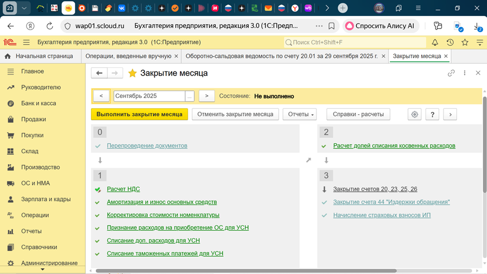 Не закрываются Счета 26, 20.01, и, как следствие, нельзя произвести Закрытие месяца в программе 1С
