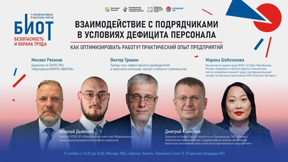 В этом году жду всех на БИОТ 2025. Выступлю в качестве спикера и буду рад ответить на ваши вопросы. 13 ноября 14:20 – 16:00 Открытая площадка №3 Пав. 3, зал 13 Взаимодействие с подрядчиками в условиях дефицита персонала. Как оптимизировать работу? Практический опыт предприятий #HSE и риски Кадровый дефицит заставляет компании всё чаще полагаться на подрядчиков. Но снижает ли это нагрузку или создаёт новые риски? На конференции мы обсудим реальный опыт предприятий: как распределять ответственность, какие стандарты безопасности внедрять и как цифровые инструменты помогают контролировать работу подрядчиков. Рассмотрим типичные нарушения и юридическую ответственность, кейсы по оптимизации процессов и снижению издержек при привлечении подрядных команд. Модератор: Виктор Тришин, Тренер-коуч эффективности руководителей и персонала компаний, эксперт в области строительства Спикеры: Михаил Рязанов, Директор по ОТиПБ ПАО «Корпорация ВСМПО-АВИСМА» Марина Шобохонова, Инспектор по охране труда Ф