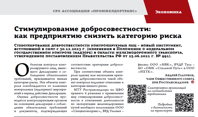 Стимулирование добросовестности контролируемых лиц – новый инструмент, вступивший в силу с 30.12.2023 г. (изменения в Положение о федеральном государственном контроле (надзоре) в области железнодорожного транспорта, утвержденное постановлением Правительства РФ от 25.06.2021 г. № 991). Объектам контроля контролируемого лица, имеющего Декларацию о соблюдении обязательных требований, присваивается низкая категория риска. Эти объекты контроля освобождаются от плановых контрольных (надзорных) мероприятий в период действия Декларации. Оценка добросовестности проводится контролирующим органом на основании декларации о соблюдении обязательных требований и документов, подтверждающих соответствие критериям добросовестности. При соответствии объекта контроля одному или нескольким критериям добросовестности такой объект контроля подлежит отнесению к категории низкого риска. МТУ Ространснадзора по ЦФО принято 4 решения о применении мер стимулирования добросовестности в отношении деятельности по экс