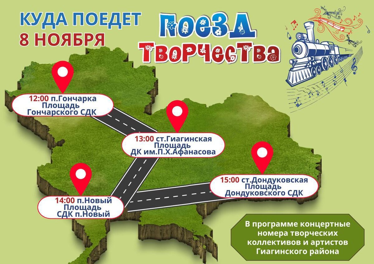 «Поезд Творчества» отправится с творческими остановками из п.Гончарка в ст.Дондуковскую. Уже в эту пятницу, 8 ноября, артисты отправятся в путь со своими творческими номерами. Какие населённые пункты они посетят в этот раз смотрите в афише. Проект реализуется в рамках достижения региональной цели «Дома культуры - центры притяжения населения». #Гиагинскийрайон #культурарайрна