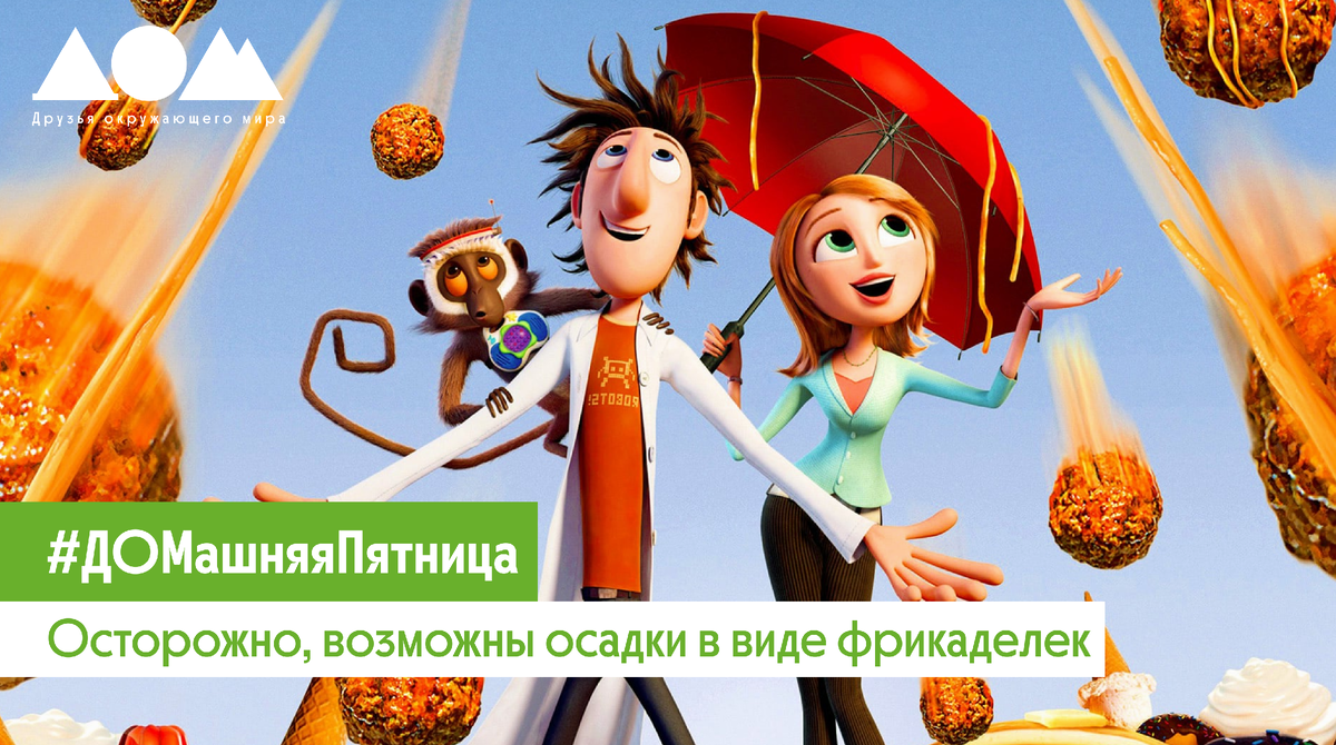 Мы не сошли с ума! Просто посмотрели мультфильм «Облачно, возможны осадки в виде фрикаделек». И советуем его вам. Немного странный ученый Флинт Локвуд хотел изобрести для своего небольшого города что-то такое, что точно осчастливит жителей. И он придумал — устройство, которое позволяет еде падать с неба. Теперь еды хватает всем. А вокруг — живописные холмы из фруктового желе. Но однажды вкусные осадки в виде фрикаделек превращаются в торнадо опасных спагетти. Из-за переизбытка пищи город быстро оказывается на грани экологической катастрофы. Ученому и его друзьям предстоит исправить положение дел в городке! Рекомендуем мультик мы не просто так. В нём поднимаются самые разные экологические проблемы: неразумное пищевое потребление, загрязнение окружающей среды, проблема утилизации мусора. Говорят, что после просмотра зрители начали задумываться над тем, точно ли стоит выбрасывать недоеденный ужин #ДОМашняяПятница
