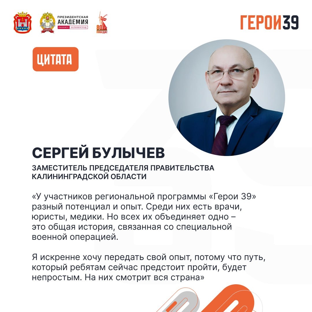 Что важно: участники программы «Герои 39» походят стажировку в правительстве Калининградской области Среди наставников – заместитель председателя правительства Калининградской области Сергей Булычев. Он подчеркнул значимость и важность участия героев в программе.