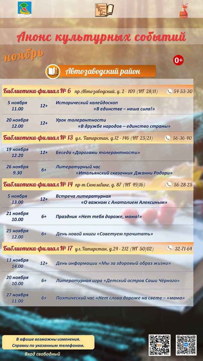 Библиотеки продолжают делать ваш досуг увлекательным и полезным! Следите за публикациями на web-сайте и подписывайтесь на группы библиотек в соцсетях ВКонтакте, Телеграмм и Дзен канале. Будет интересно! Обратите внимание: расписание может незначительно меняться. Для получения точной информации о мероприятиях обращайтесь по указанным контактам в библиотеки-филиалы. Контакты на странице Библиосеть.