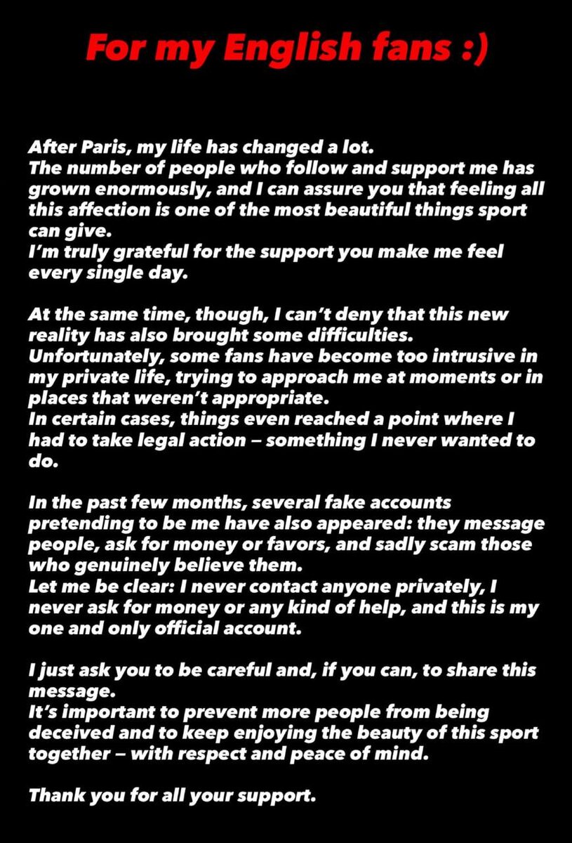 За последние несколько месяцев также появилось несколько фейковых аккаунтов, выдающих себя за меня: они пишут людям сообщения, просят денег или услуг и, к сожалению, обманывают тех, кто им искренне верит.