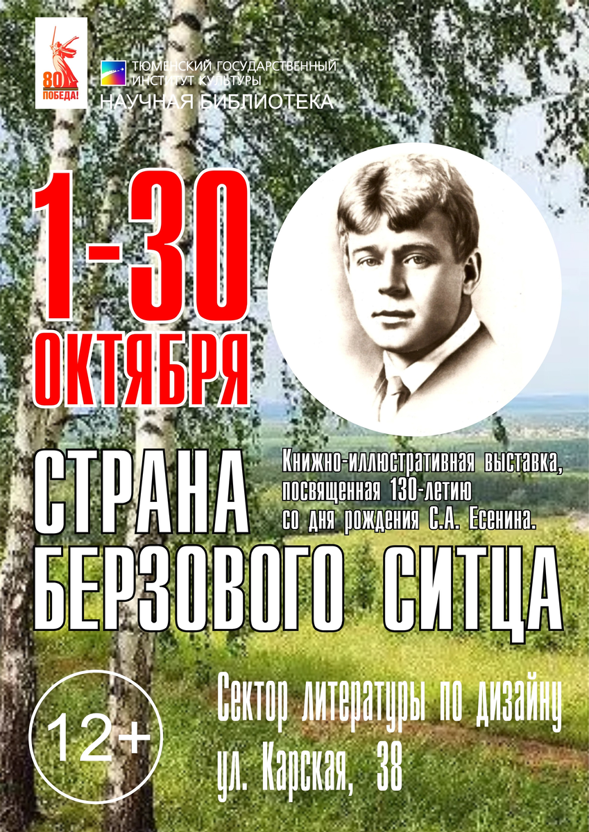 В секторе литературы по дизайну (ул. Карская, 38, ауд. 302) научной библиотеки ТГИК в рамках цикла мероприятий, посвященных празднованию 130-летия со дня рождения С.А. Есенина, открылась книжно-иллюстративная выставка «Страна берёзового ситца». Сергей Есенин – один из самых известных и любимых поэтов в России. Из-за стихов о родной природе, глубоких личных переживаний и стремления к свободе его называют «певцом русской души». Поэзия Есенина отличается простотой и ясностью языка, а также богатым использованием образов, основанных на народном творчестве и фольклоре, что сделало его стихи близкими и понятными широкому кругу читателей. В творчестве Сергея Есенина природа и человек неразрывно связаны, при этом образ березы выступает как символ России, красоты и переменчивости жизни, а также как отражение внутреннего мира самого поэта. В стихах Есенина природа оживает, становясь собеседником и олицетворением гармонии, а береза, с ее нежным обликом и изменением в зависимости от сезона, символ
