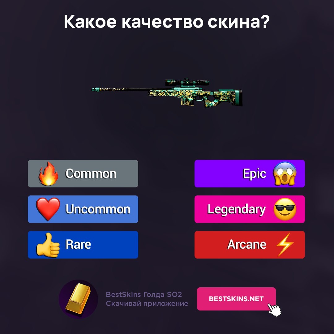 Какое качество скина? BestSkins SO2 Common, Uncommon, Rare или Arcane? Ставь реакцию — проверим, кто шарит! 🔥 ❤️ 👍 😱 😎 ⚡️ 📲 Скачать - https://bestskins.net