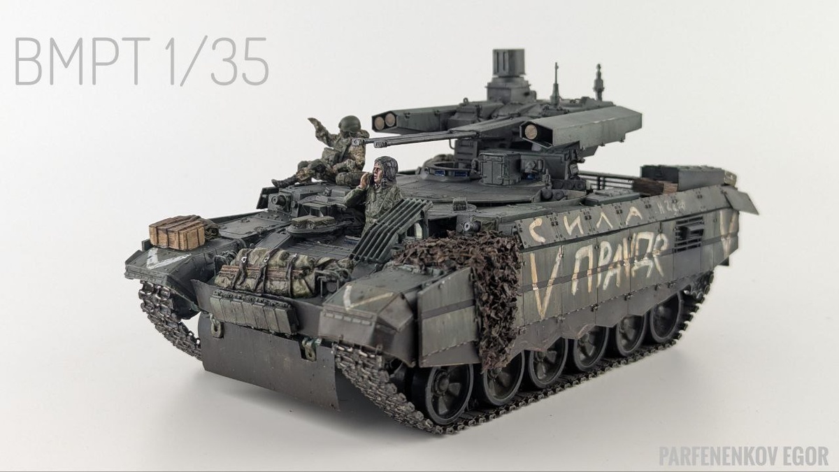 БМПТ "Терминатор" Zvezda, 1/35 •Дополнения:MiniArm-Конверсионный набор-35279, MasterClub-Металлическте траки-35085, ArmaModels-опорнве катки-AM3558, Микродизайн-сетки мто-МД035304, печатная фигура с али, фигура танкиста Tamiya, печатные скатки Самодельные допы: мангал,триплексы, решетка у люка,маск. сеть. •По покраске: задул в нц-1200 от Аммо миг,высветлил его слоновой костью и прошёлся по граням; всё резинотканевое и резиновое:черный+белый на глаз; стволы в ганметал. •Погодинг: жидкости от Ак и Аммо Миг,потом прошёлся смывкой от Тамии. Мангал ржавил маслом, основной цвет серый, скатки красил в три цвета:база, чуть посветлее и очень светлый, потом самопальная темная проливка. Траки в конце шлифанул по грунтозацепам. •Триплексы: подложка из серебра от Ганзы и синий лак от Тамии. •Ощущения от работы: набор от Звезды очень хороший, как по наполнению, так и по качеству; от Миниарма ожидал большего, остальные вполне хорошо. •Надеюсь вам, как и мне нравится итоговые результат, буду рад по