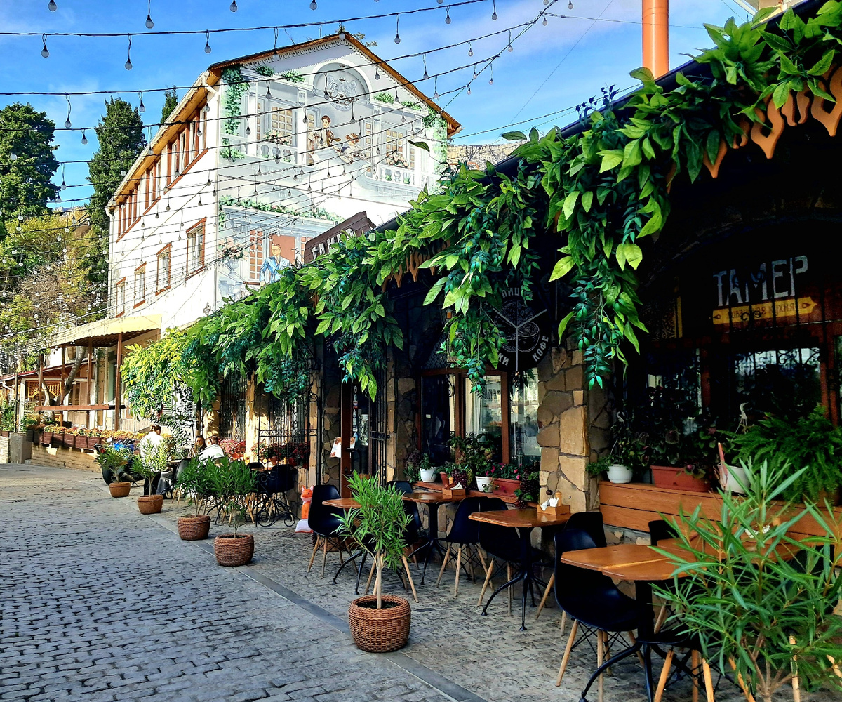 Алупка - совсем небольшой городок на южном берегу Крыма, нежно любимый туристами. Считается, что в межсезонье здесь особо делать нечего и жизнь замирает, но только не в эти осенние каникулы! Народу в Алупке было много, как никогда! Здесь есть где погулять, городок хоть и небольшой, но очень красивый! Столько фотолокаций! Открыты многие кафе, рестораны, можно посидеть внутри, а можно на улице - погода позволяет! Все такое красивое вокруг! Внутри кафе веселые интерьеры. И безумно вкусные веганские десерты! Не обязательно для веганов, а просто для тех, кто не любит обычные и для кого они кажутся чересчур сладкими. Все украшено очень по-осеннему. Считается, что Алупка - одно из самых теплых мест даже по меркам ЮБК. Это так! Зима здесь очень мягкая, правда у моря часто ветренно. Гораздо более, чем в Ялте. Но об этом позже, а пока вернемся в город. Старые дачи реставрируют в большом количестве. Вот эту закончили. Красота же? И еще красоты. Ступени в старый город. Но о нем я у