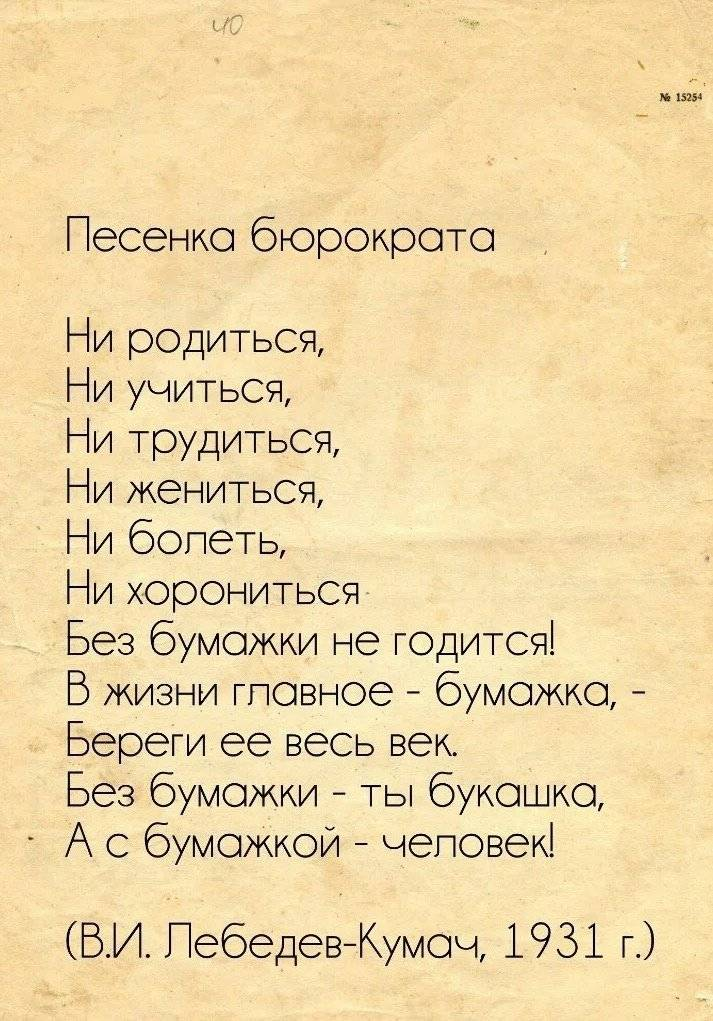 Выражение «Без бумажки ты букашка, а с бумажкой человек» не устаревает с годами. Об этом я сужу по тому, что на эту тему много мемов. Так с иронией говорят о том, что нужно иметь документы, справки на все случаи жизни, или с сарказмом отзываются о всесилии канцелярщины и бюрократического формализма. Сама фраза – это цитата из «Песенки бюрократа», сочиненной поэтом Василием Лебедевым-Кумачом и композитором Константином Листовым в 1931 году для эстрадного обозрения «Вопрос ребром». В народе, правда, фразу порой слегка переиначивают, заменяя «букашку» «кaкaшкoй». Ну что, смотрим мемы. В некоторых мемах обыгрывается похожее по значению выражение: «Докажи, что ты не верблюд», но это уже другая история. ДРУГИЕ СТАТЬИ КАНАЛА «Когнитивный диссонанс» – термин и мем Мемы со словом капец Фаина Раневская как мем