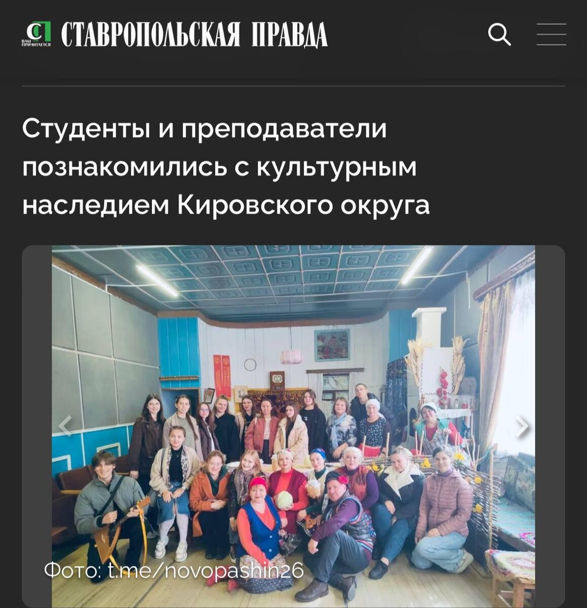 #КировскийокругвобъективекраевыхСМИ В Кировском муниципальном округе прошла насыщенная культурно‑просветительская программа для студентов и преподавателей кафедры народного пения и этномузыкологии ГБУК «СКДНТ», сообщается в телеграм-канале главы муниципалитета Николая Новопашина. Первым пунктом программы стал Дом культуры посёлка Коммаяк, где гостей радушно встретили и представили театрализованное представление «Капустные вечёрки». Зрители погрузились в атмосферу народных традиций и сельской жизни, познакомившись с самобытным фольклорным творчеством региона. После театрального действа участники отправились в Новопавловский историко‑краеведческий музей. Там состоялось мероприятие в формате «живой встречи» при участии Образцового ансамбля «Станичники» под руководством Ивана Степановича Ковальчука. В рамках встречи сотрудники музея провели для гостей познавательную экскурсию, рассказав об основных вехах истории города. Кульминацией программы стало выступление ансамбля «Станичники», ко