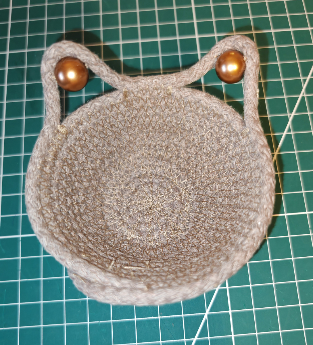 Солнечного дня! Постепенно буду выкладывать тут уже созданные работы, ну и в параллель создавать новые. Начну с корзинки с кошачьими ушками. Вдохновилась работами из шнура с различными животными и решила сделать кошечку - люблю кошек, они обязательно должны быть в моих творческих воплощениях, сами просятся. Корзинка получилась очень маленькая, буквально для пары мелочей, украшений, ключей или, если использовать на кухне, то подойдёт для одного яйца, некоторые делают яичницы на пасху с заячьими ушами вместо кошачих. Хвостик решила закрепить, а не оставить на свободе, возможно, в другой раз сделаю его болтающимся, посмотрим. Добавила бусины, мне кажется с ними стало игривее.