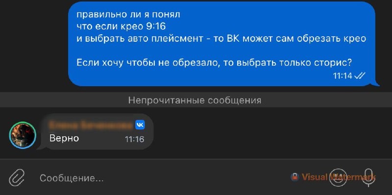 Сейчас я переписываюсь с менеджером ВКонтакте — таким менеджером назначают, если у вас есть большой рекламный бюджет. Важно для тех, кто запускает рекламу с целью «сообщения»: если вы используете видео-креатив в формате 9:16 и при этом выбираете автоплейсмент, то ВКонтакте может самостоятельно изменить формат вашего видео (например, обрезать его до 4:5). В результате часть текста или изображения может обрезаться, и креатив будет отображаться некорректно. Подробнее в справке https://ads.vk.com/help/features/safe