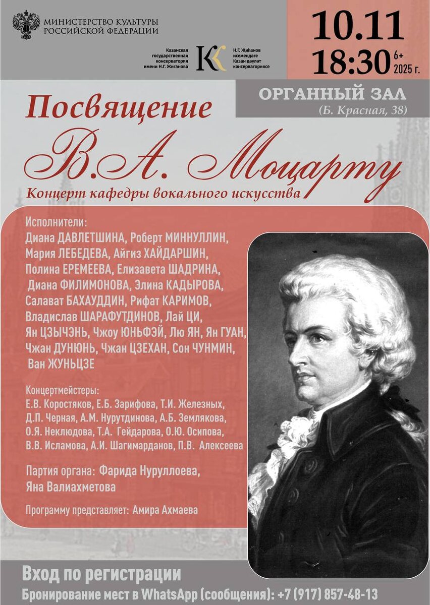 КОНЦЕРТ ПОСВЯЩЕНИЕ В.А. МОЦАРТУ🎵 🗓️ 10 ноября ⏰ 18:30 💸 бесплатно 🏫 Казанская консерватория имени Н. Г. Жиганыов 📍 ул. Большая Красная, 38, Органный зал Вход по регистрации! Бронирование мест по WhatsApp (сообщения) +7 (917) 857-48-13 ➡️ ПОДРОБНОСТИ ⬅️ ❗️ Детская Афиша | Казань Больше информации в нашей группе, переходите