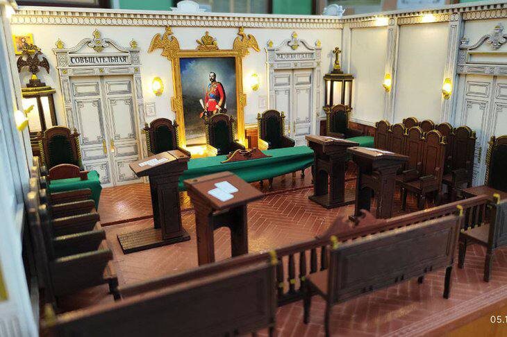 В иркутском музее истории судебной системы Приангарья появился зал суда 19 века. Правда, в миниатюре Такое помещение было в Иркутском окружном суде в 1897 году. Макет создал иркутский блогер и мастер-миниатюрист. Чтобы добиться исторической точности, автор изучал архивные фото, документы и исследования сотрудника музея «Тальцы». В миниатюре есть массивный судейский стол, скамьи для подсудимых, места для слушателей и стражников, символ правосудия — зерцало, а также картины, иконы и старинные канцелярские принадлежности. На изготовление ушло около 26 часов. Идея принадлежит заместителю председателя Иркутского областного суда Светлане Чертковой. Светлана Черткова: Это не только интересно, но и очень полезно и информативно. До создания в нашем музее полноразмерного зала судебного заседания 19 века, а есть и такие планы, такой макет улучшит визуальное восприятие экскурсии, сделает экспозицию еще более интересной и привлекательной для зрителей любого возраста. Посетители смогут легко пре