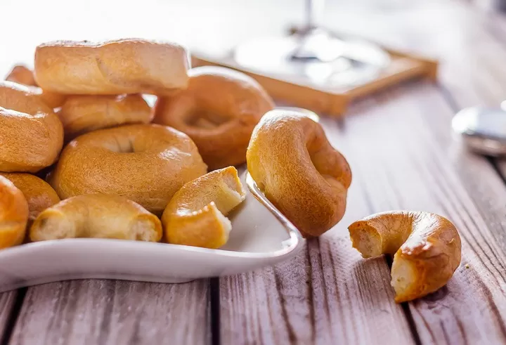 3. Разделите массу на примерно 24 части, скатайте каждую в колбаску, сверните кольцом и разложите на присыпанном мукой полотенце.