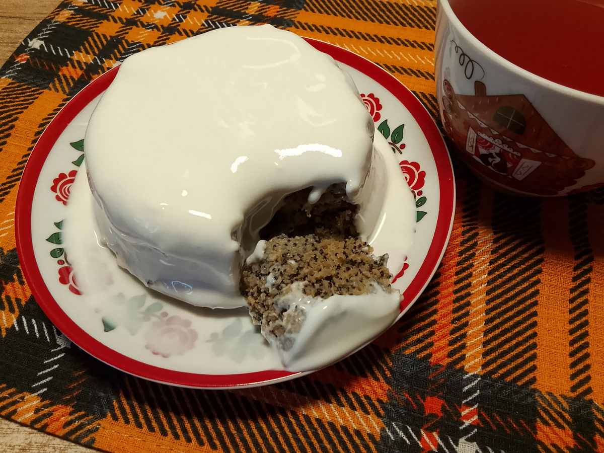 Maгкейк (mud cake)— это десерт, который переводится как "кекс в кружке". Готовят такой десерт в микроволновке, буквально, за 5-7 минут. Подают на стол его в горячем или теплом виде, смазав сметаной или заварным кремом, добавив мороженое или полив глазурью. Разбейте в чашку яйцо, всыпьте сахар и разрыхлитель. Перемешайте. Добавьте мак, яблочное пюре и молоко. Всыпьте муку и псилиум. Тесто хорошо вымешайте. Форму для СВЧ смажьте маслом и выложите тесто. Я выпекала магкейк при 800W 6 минут. Десерт слегка остудите. Я смазала выпечку сметаной, смешанной с не большим количеством сахара. Магкейк получился мягкий, в меру кисло-сладкий и ароматный. ингредиенты: яйцо- 1 шт. сахар- 0.5 ст.л. разрыхлитель - 0.5 ч.л. яблочное пюре - 100гр. молоко - 50 мл. мак - 15 гр. мука - 20 гр. псилиум - 10 гр.